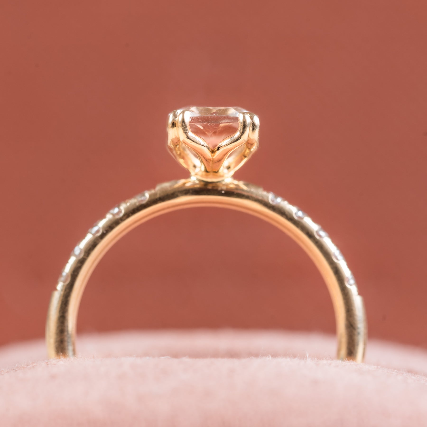 En ring som fångar känslan av romantik och mjuk elegans. I centrum står en 1,23 ct morganit, vars pudrigt rosa ton ger ett varmt, kärleksfullt uttryck. Den ovala ädelstenen ramas in av tio briljantslipade diamanter, fem på varje sida, som subtilt förstärker glansen och för tankarna till klassisk skönhet med modern twist.